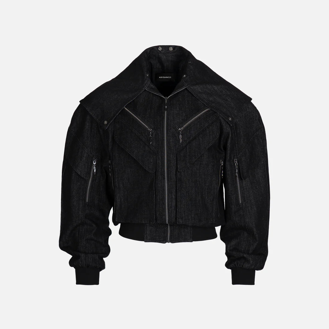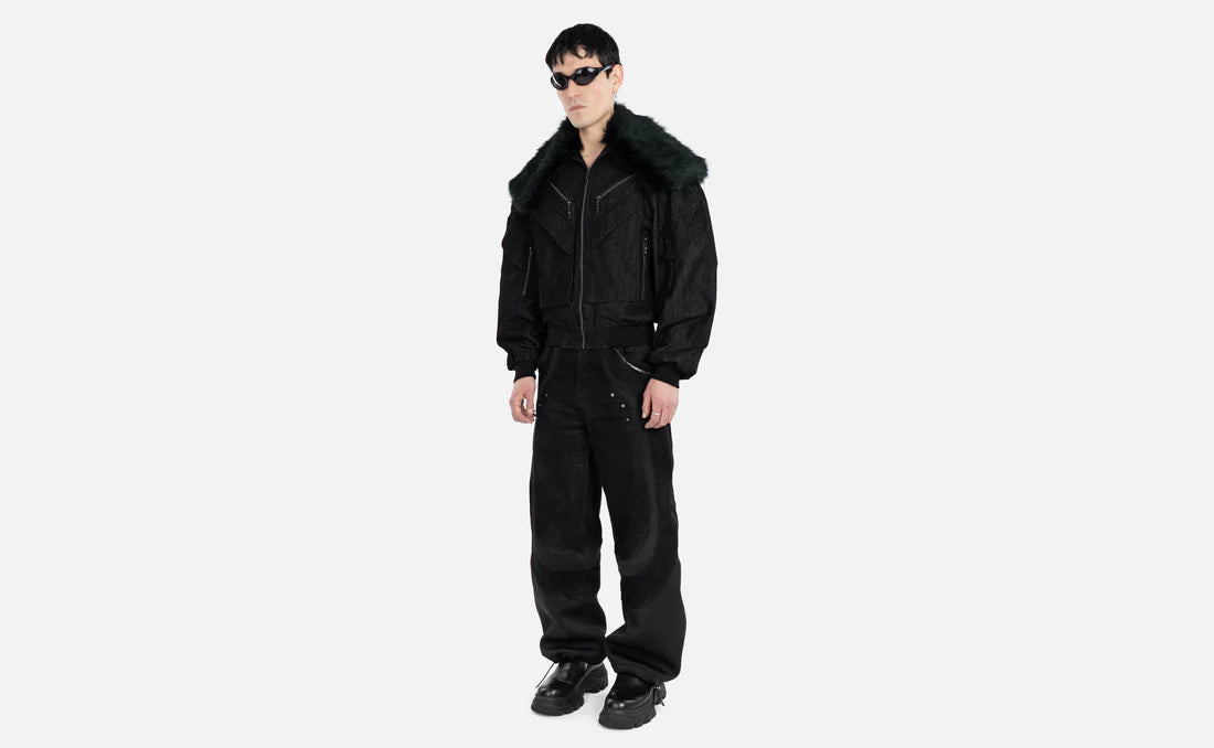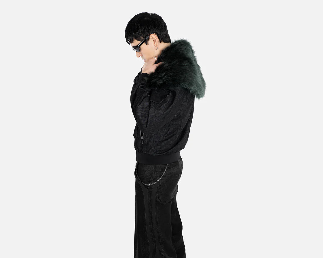 Reimagined bomber-style jacket in textured black denim with a removable dark green-tinted faux-fur collar, blending utilitarian and bohemian style influences.