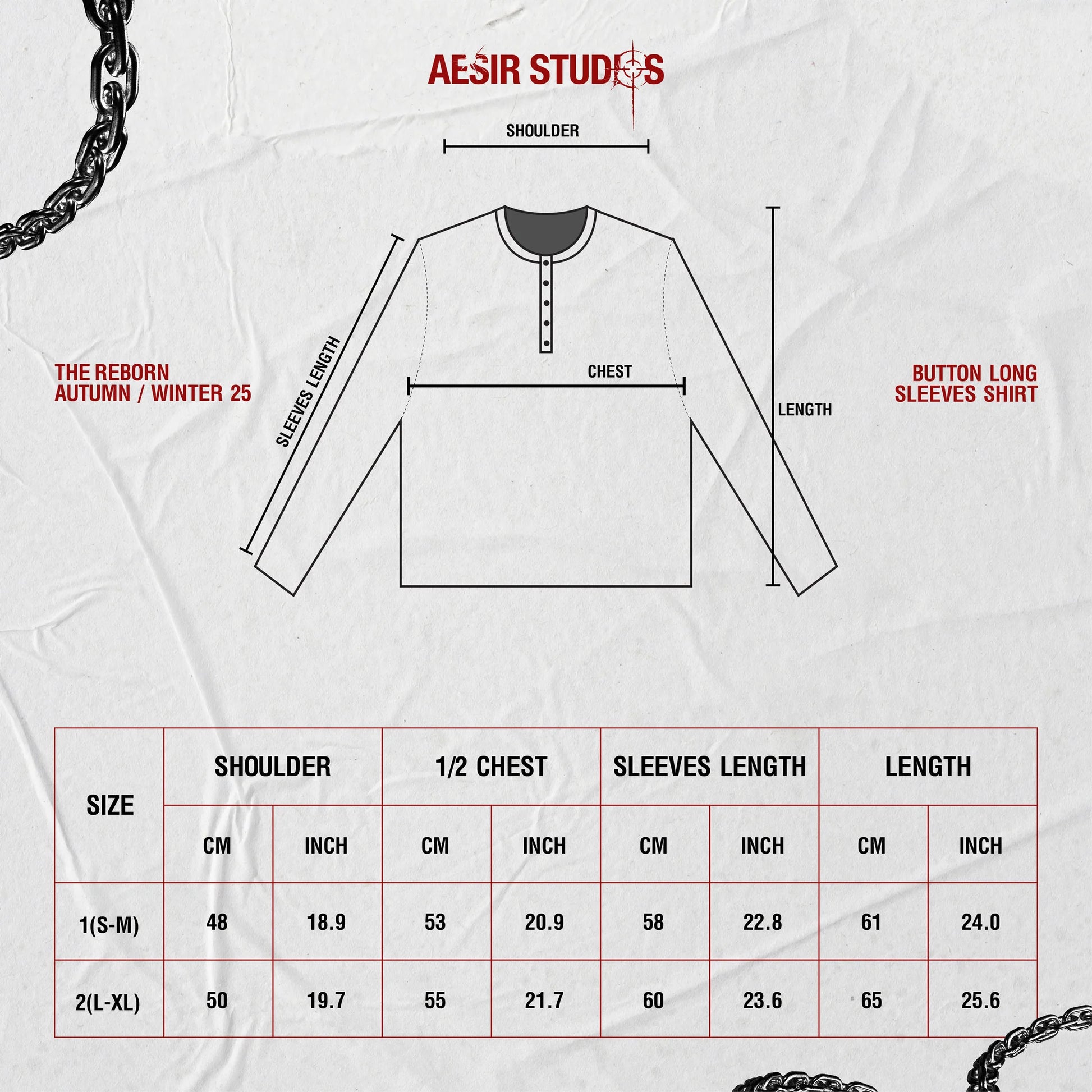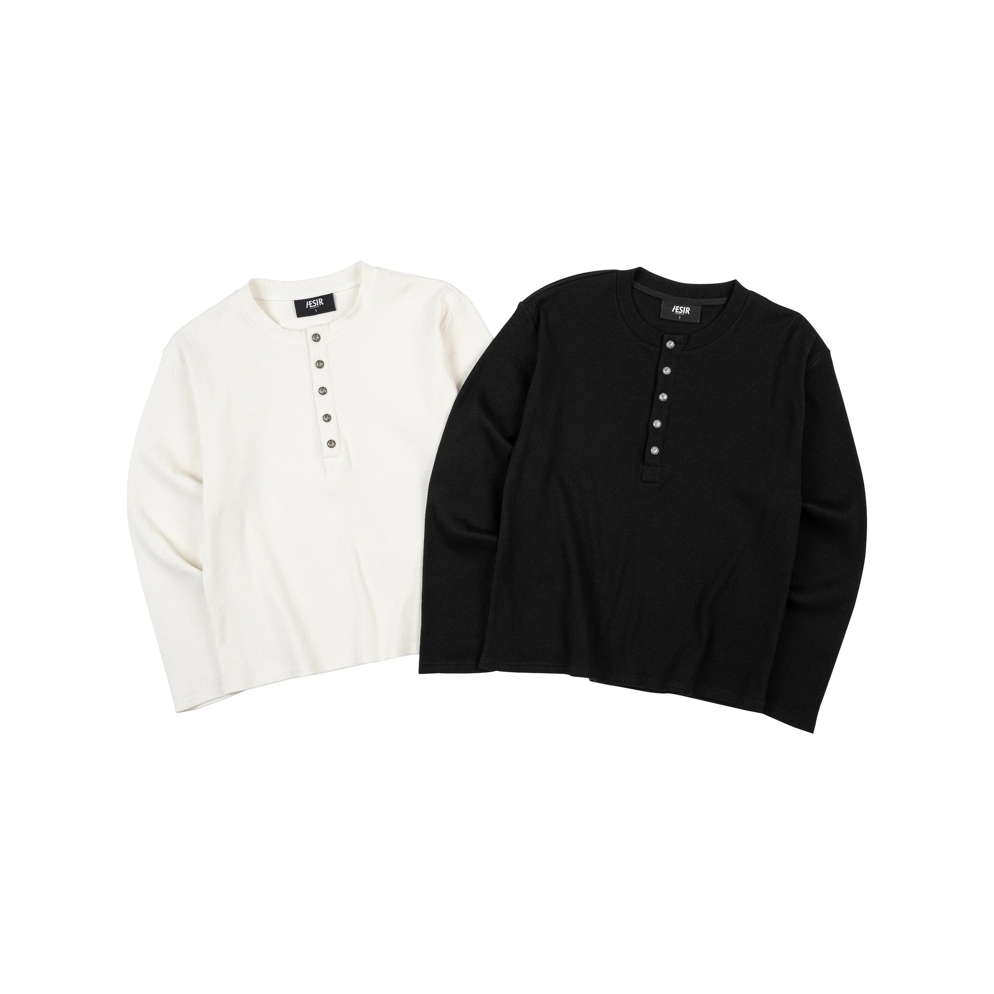 Long-sleeve Henley tee with a low, banded collar and front snap buttons.