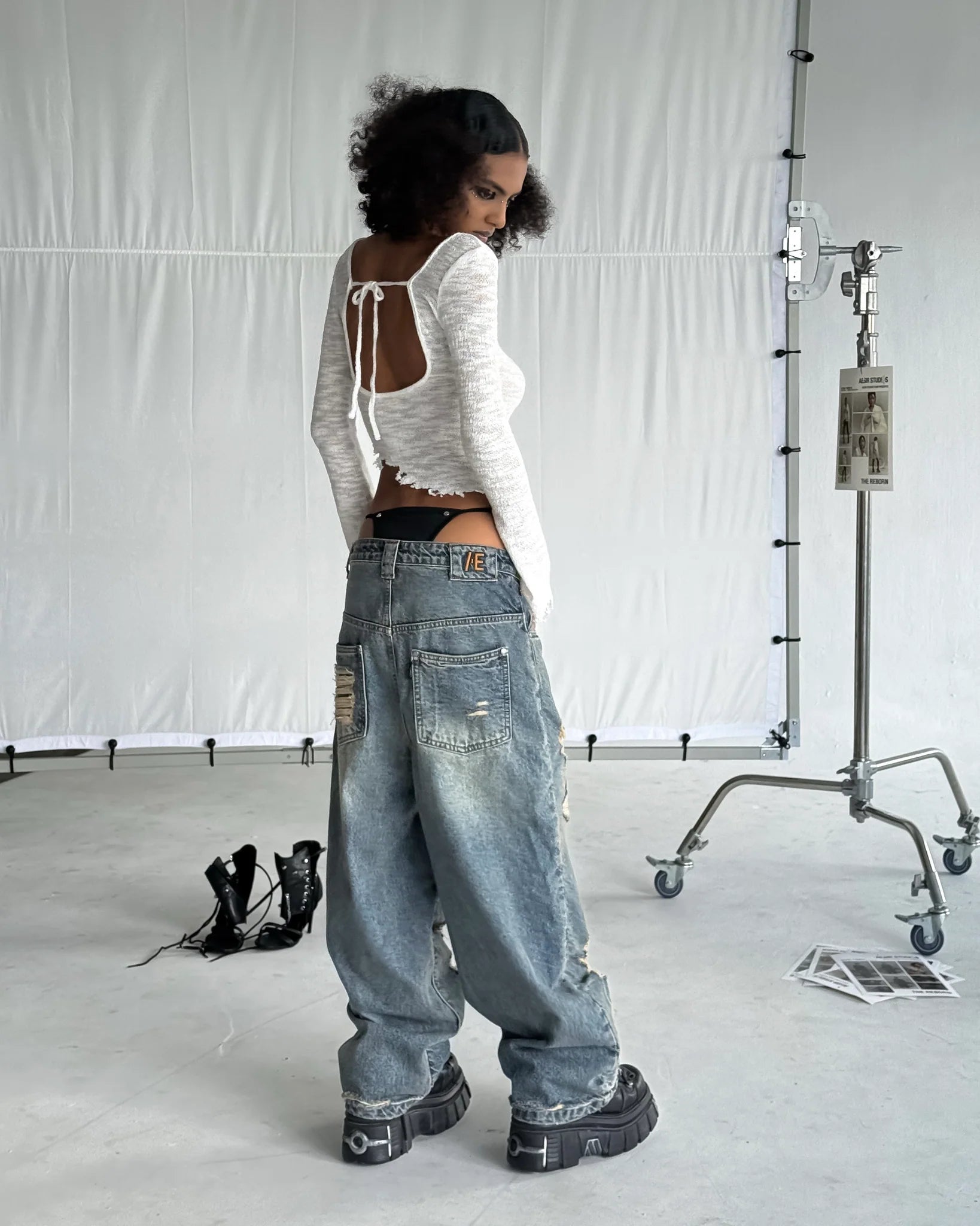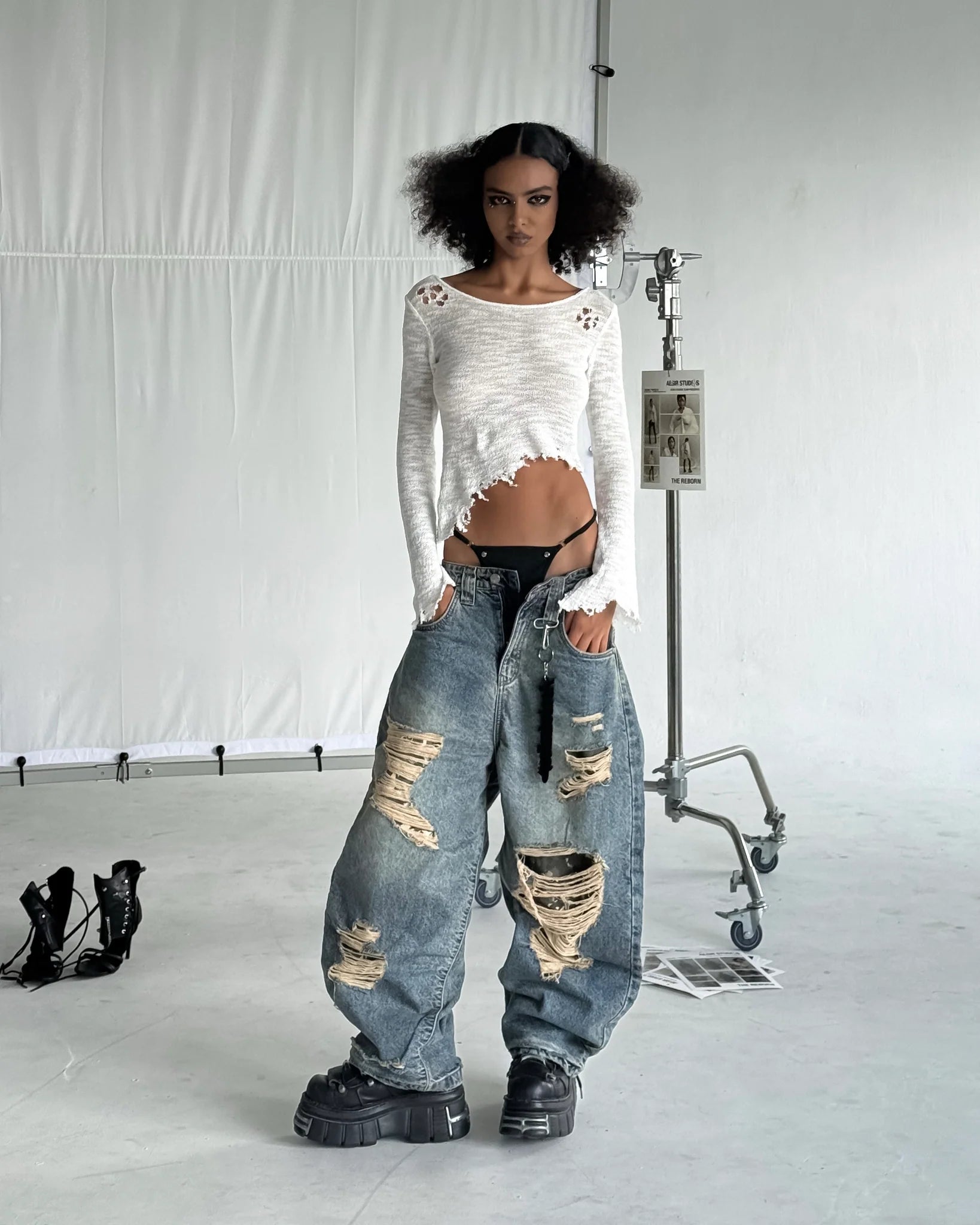 Cropped long-sleeve tee with a body-hugging fit, featuring an asymmetrical frayed hem for an edgy touch. Lightweight, semi-sheer knitted fabric — soft, stretchy, and comfortable yet sexy.